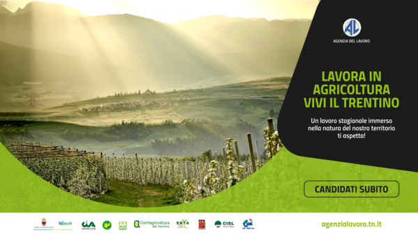 Grazie ad un'intesa tra Agenzia del Lavoro, Associazioni di categoria degli agricoltori, Sindacati e l'Ente bilaterale agricolo Trentino, anche quest’anno è avviata una campagna di raccolta di candidature per attività stagionali nel settore agricolo per il periodo luglio-ottobre 2022.
