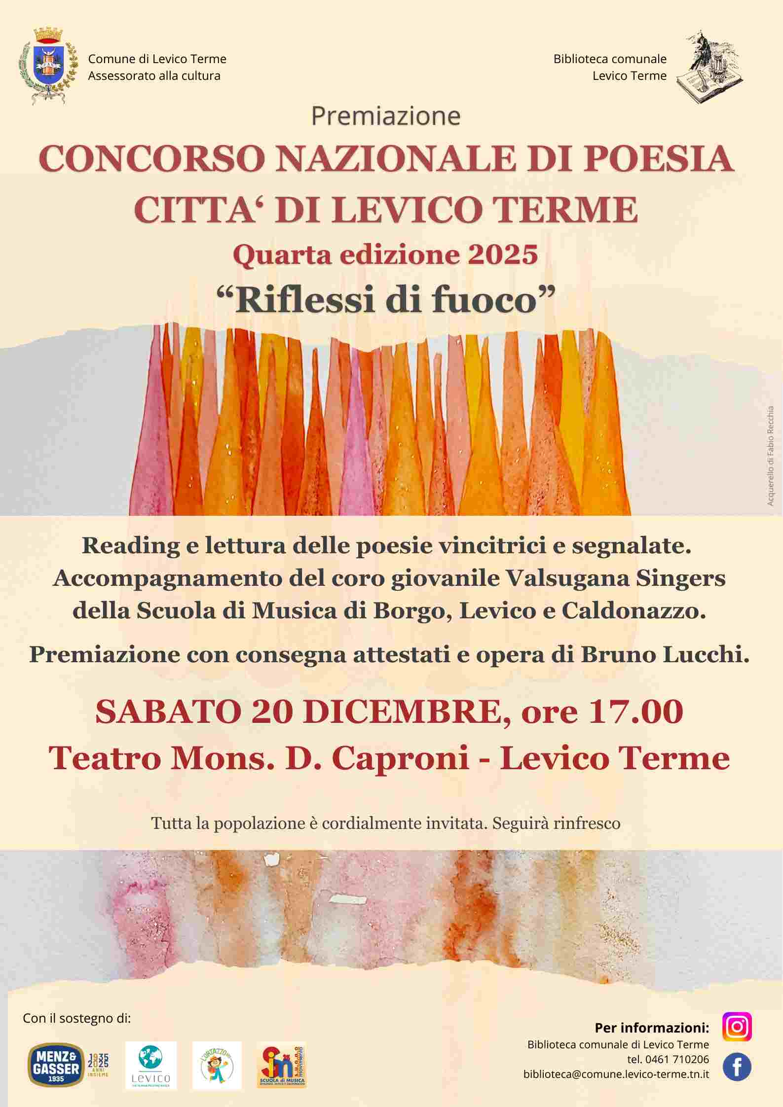 Sabato 20 dicembre ad ore 17:00 presso il Teatro Mons. Domenico Caproni di Levico Terme si terrà la premiazione della quarta edizione del Concorso nazionale di Poesia Città di Levico Terme “Riflessi di fuoco”, promosso e organizzato dall’Assessorato alla Cultura del Comune di Levico Terme e dalla Biblioteca comunale.Il programma della serata prevede un reading e a seguire la lettura delle poesie vincitrici e segnalate, con premiazione e consegna degli attestati e opera di Bruno Lucchi.